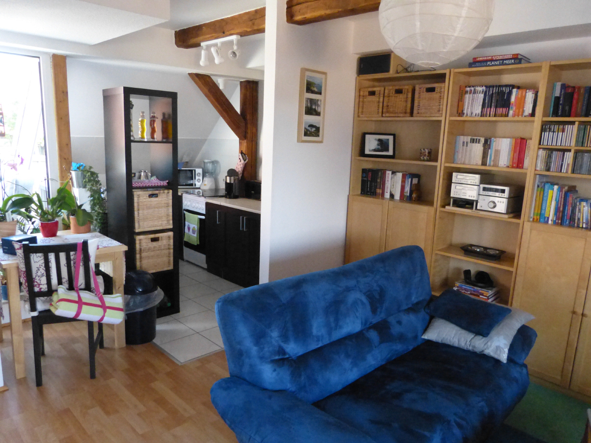 im DG eines schönen Gründerjahrehauses, 75 qm Wohnfläche auf zwei Ebenen, Flur und Küche große weiße Bodenfliesen, weiß gefliestes Badezimmer, Eck-Wanne, beheizter Handtuchhalter