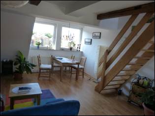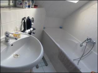 im DG eines schönen Gründerjahrehauses, 75 qm Wohnfläche auf zwei Ebenen, Flur und Küche große weiße Bodenfliesen, weiß gefliestes Badezimmer, Eck-Wanne, beheizter Handtuchhalter